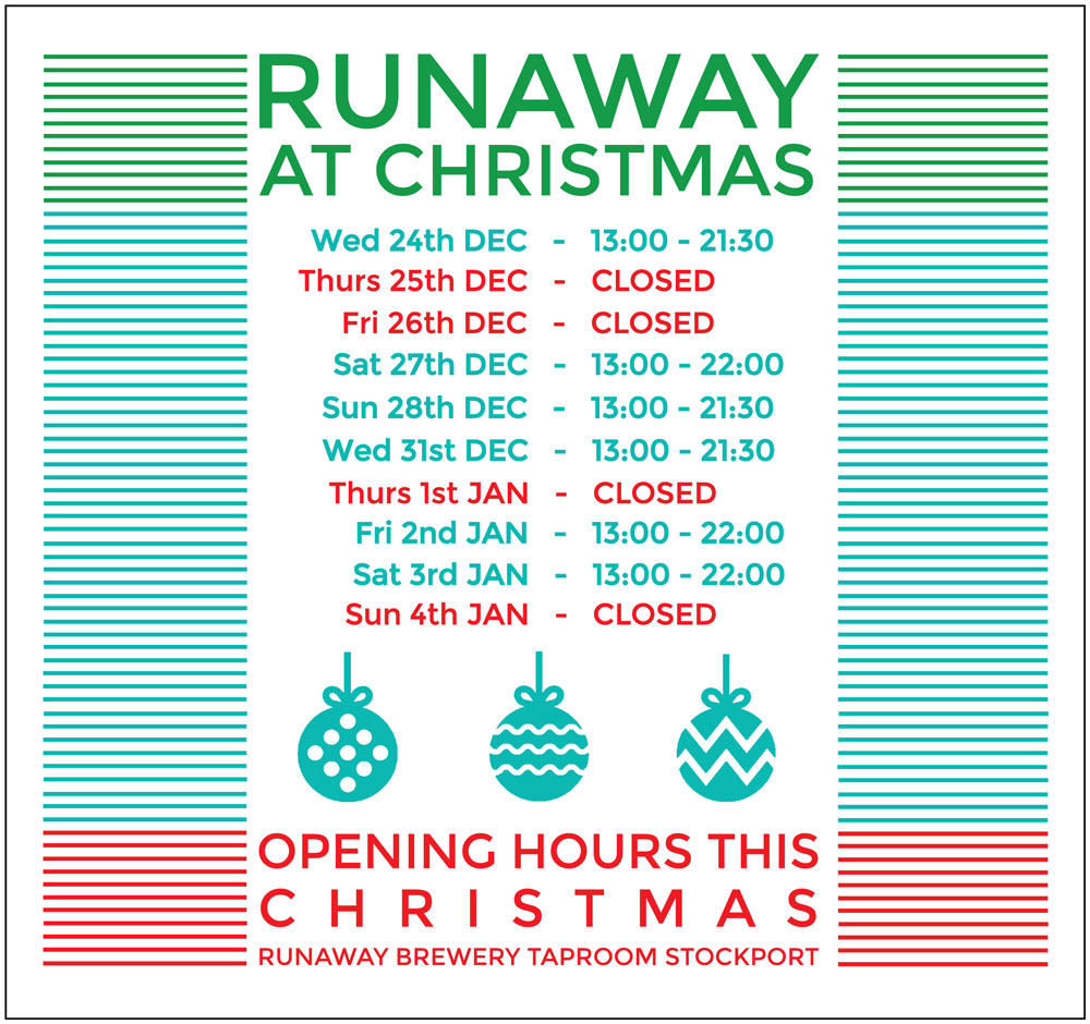 Taproom opening hours will be a little different to usual over the Xmas period - with added opening hours on both Xmas Eve and New Years Eve plus extended opening on Sunday 28th Dec. We'll also be closed on all of the Bank Holidays plus Sunday 4th Jan.
